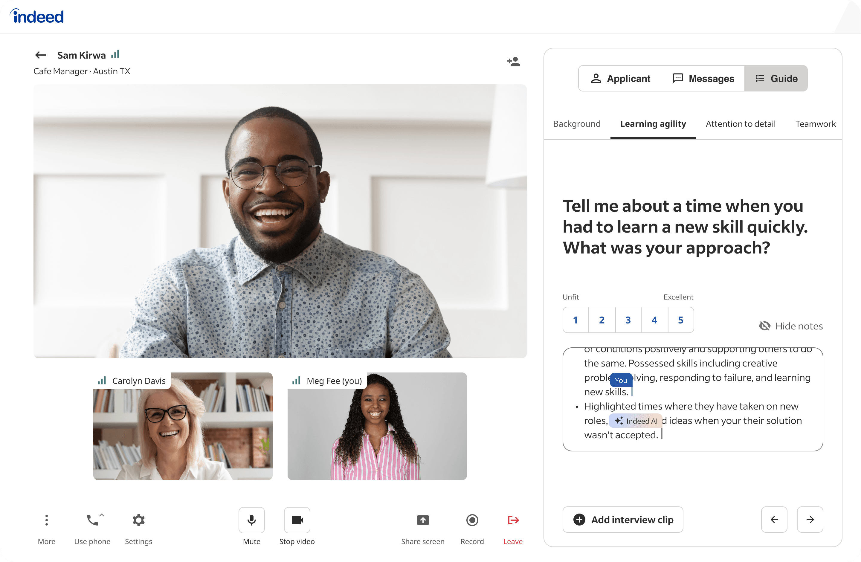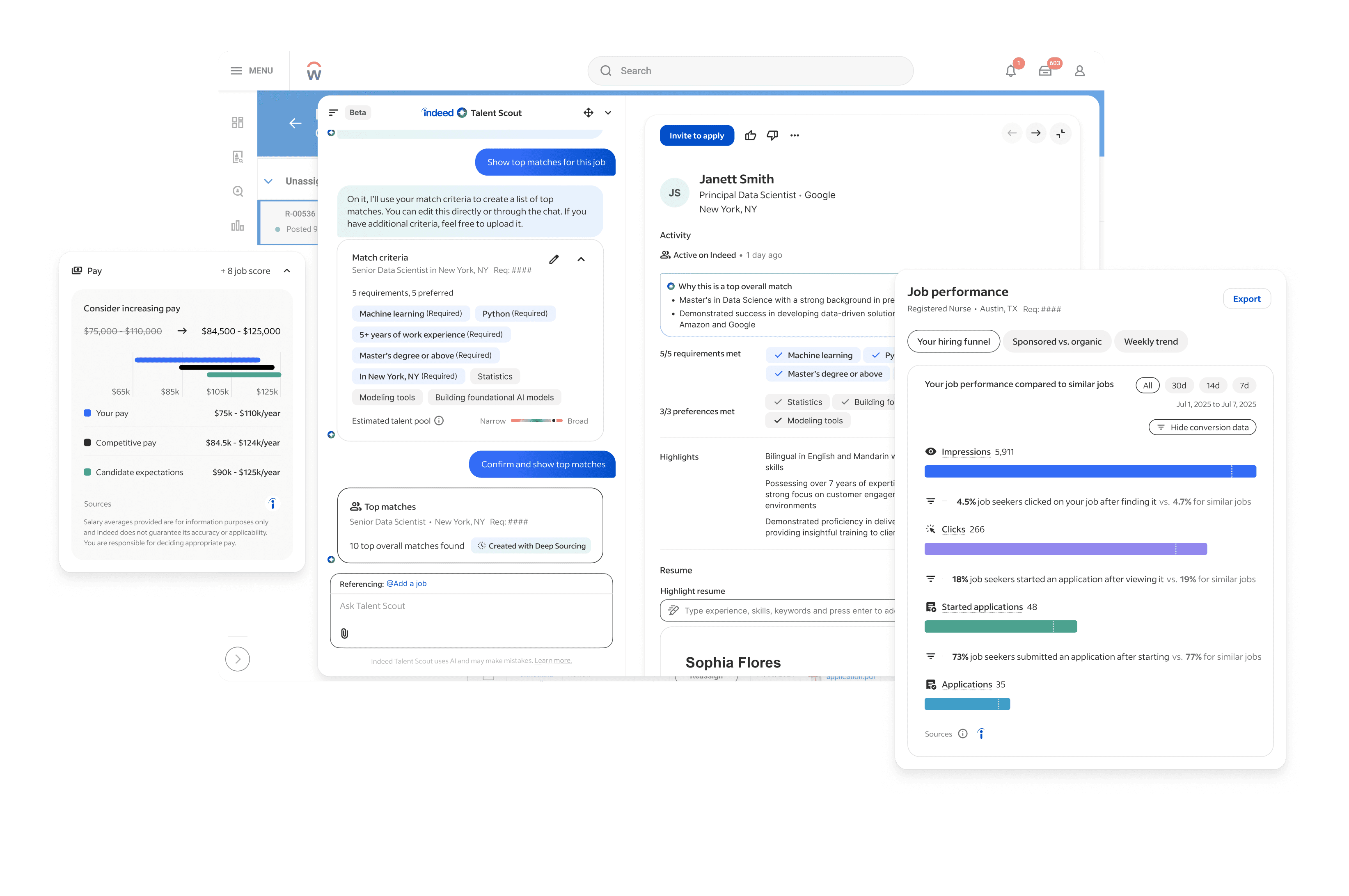 I'm currently designing for Indeed's employer-facing AI agent, Talent Scout - a conversational assistant across Indeed and ATS that's grown to thousands of users.